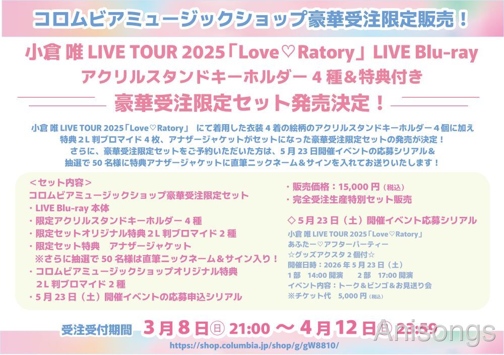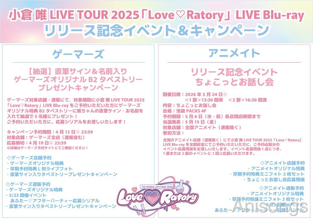 「小倉唯 LIVE TOUR 2025~Love♡Ratory~」は、2025年7月から8月にかけて全国4都市5公演で開催されたライブツアー。Blu-rayには全公演の中から厳選された映像が収録される。